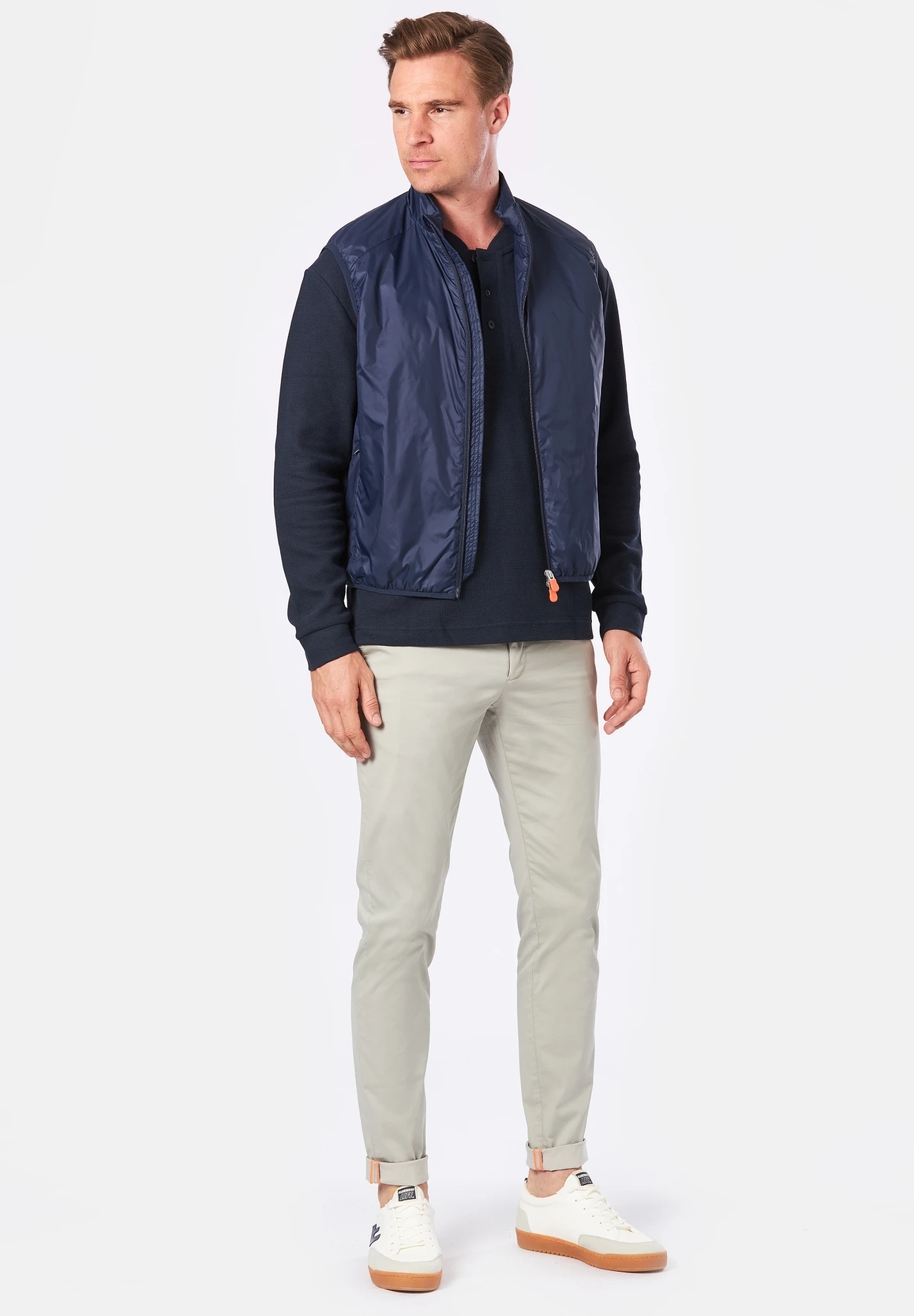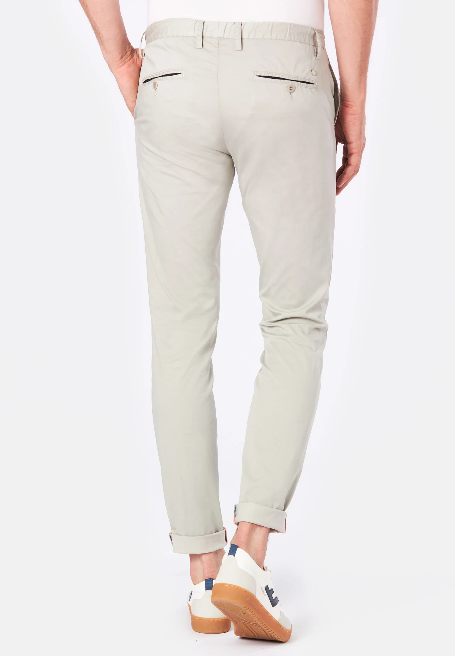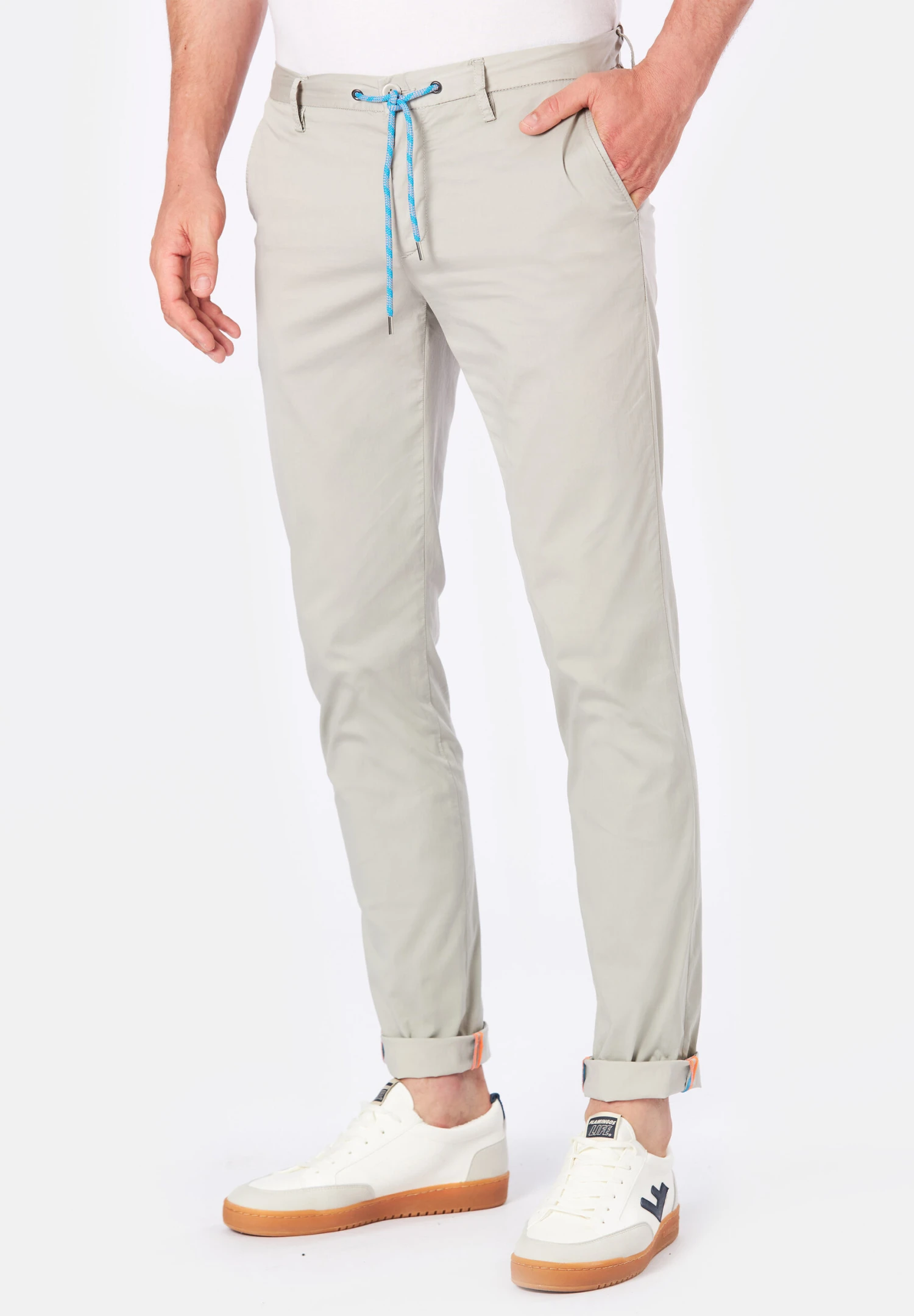 Extra leichte Sommerware. Moderne, coole Optik trifft auf einen exzellenten Tragekomfort. Sehr feine Garne sorgen für einen angenehm kühlen Griff. Die Garment Dyed Färbung gibt der Hose eine lässige Ausstrahlung. Das Modell Jump in modischer Tunnelzugvariante mit leuchten orangefarbenden Kordeln unterstützt den perfekten Sommerlook.