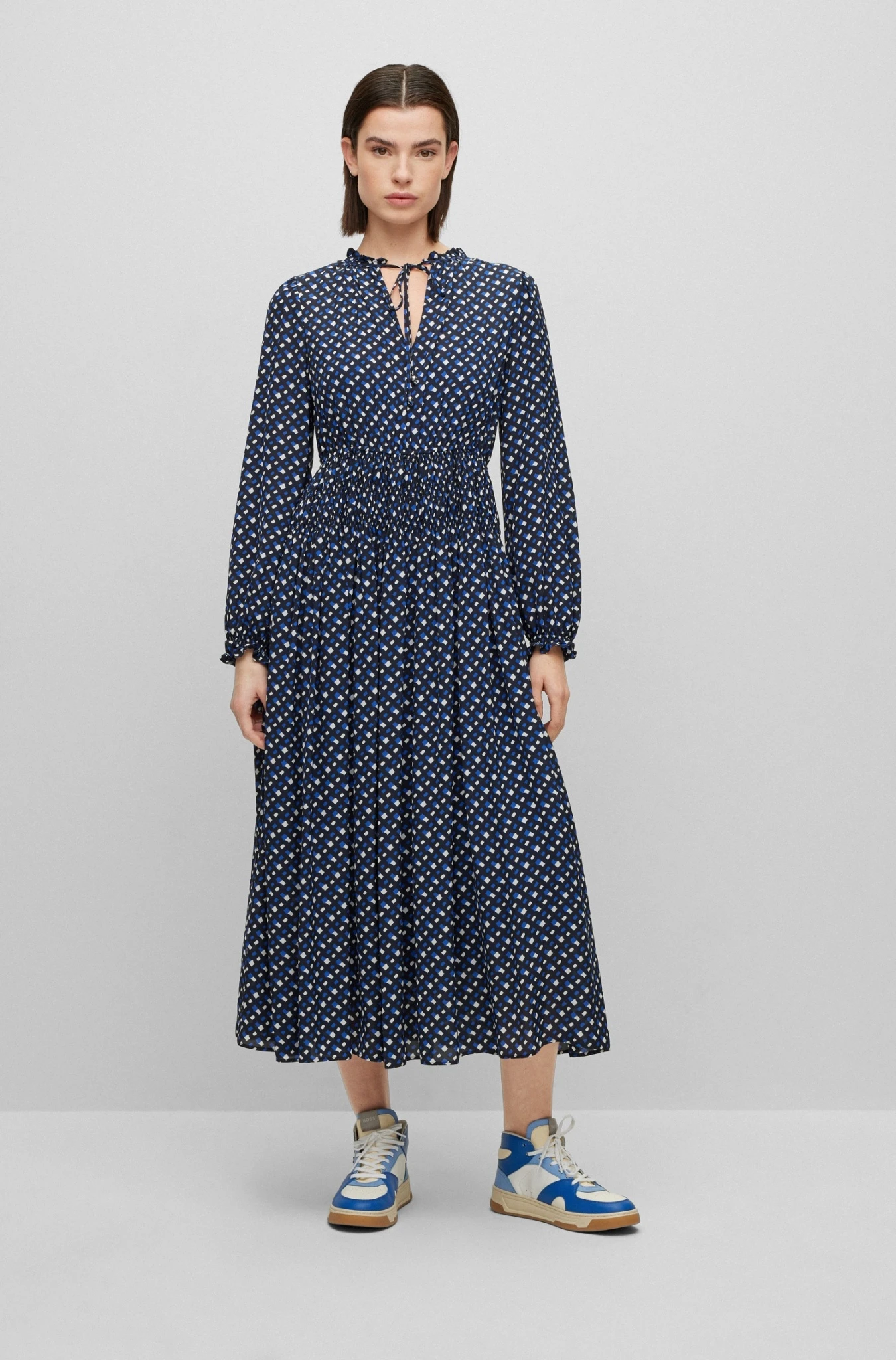 Feminines BOSS Maxikleid mit fließendem Rock. Das Langarm-Kleid aus einem leichten Material-Mix mit durchgehendem Monogramm-Print ist mit einem Bindeband am Ausschnitt versehen. Raffungen an der Taille schmeicheln deiner Figur. Für unsere RESPONSIBLE Produkte verwenden wir immer mindestens 60 % nachhaltigere Rohmaterialien. Dieses Produkt wird mit zertifizierten Zellulosefasern gefertigt, die aus dem natürlichen Rohstoff Holz aus nachhaltiger bewirtschafteten Wäldern gewonnen werden. Gemeinsam mit externen Organisationen setzen wir uns für den respektvollen Umgang mit Urwäldern und gefährdeten Wäldern ein.