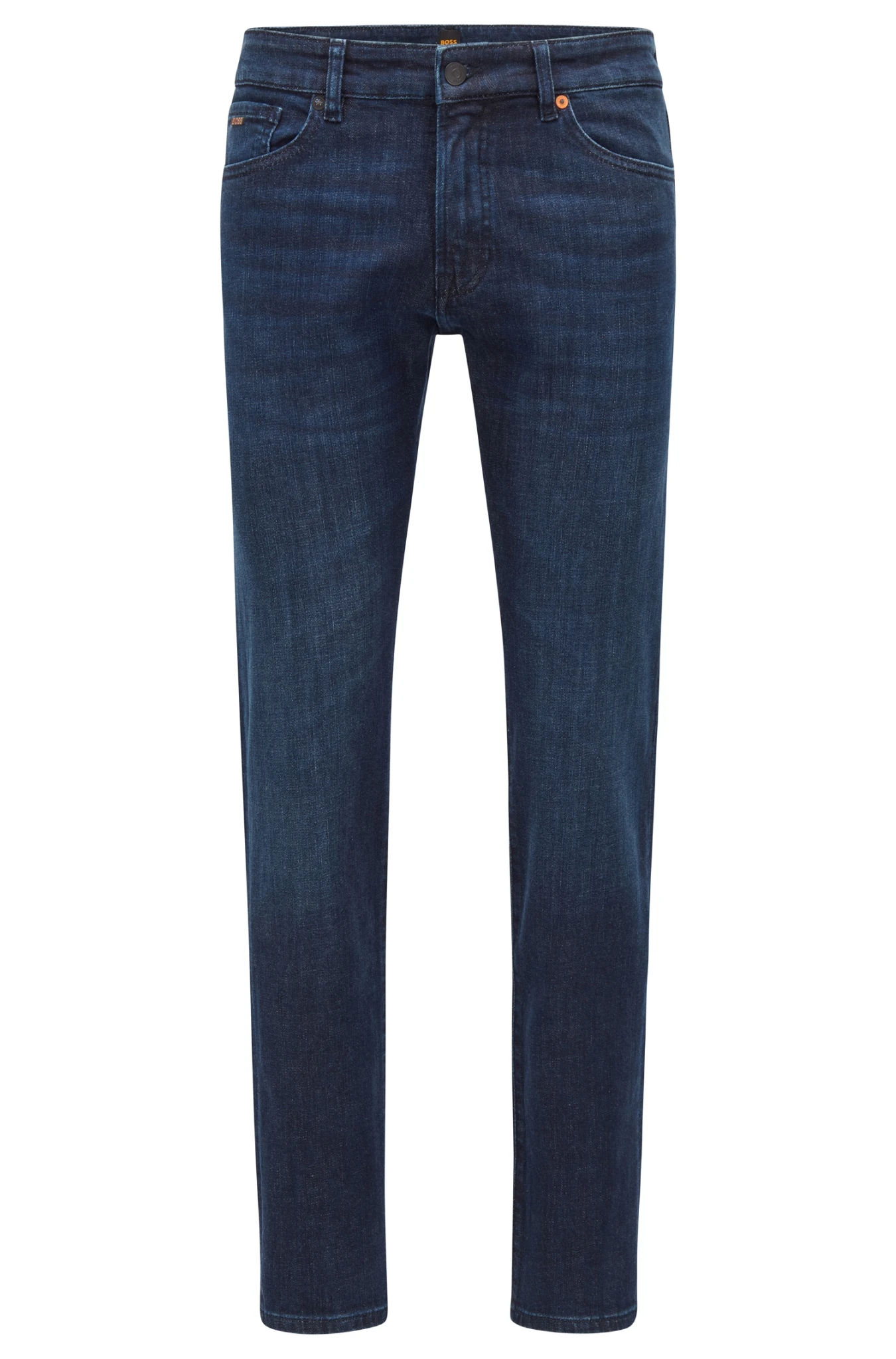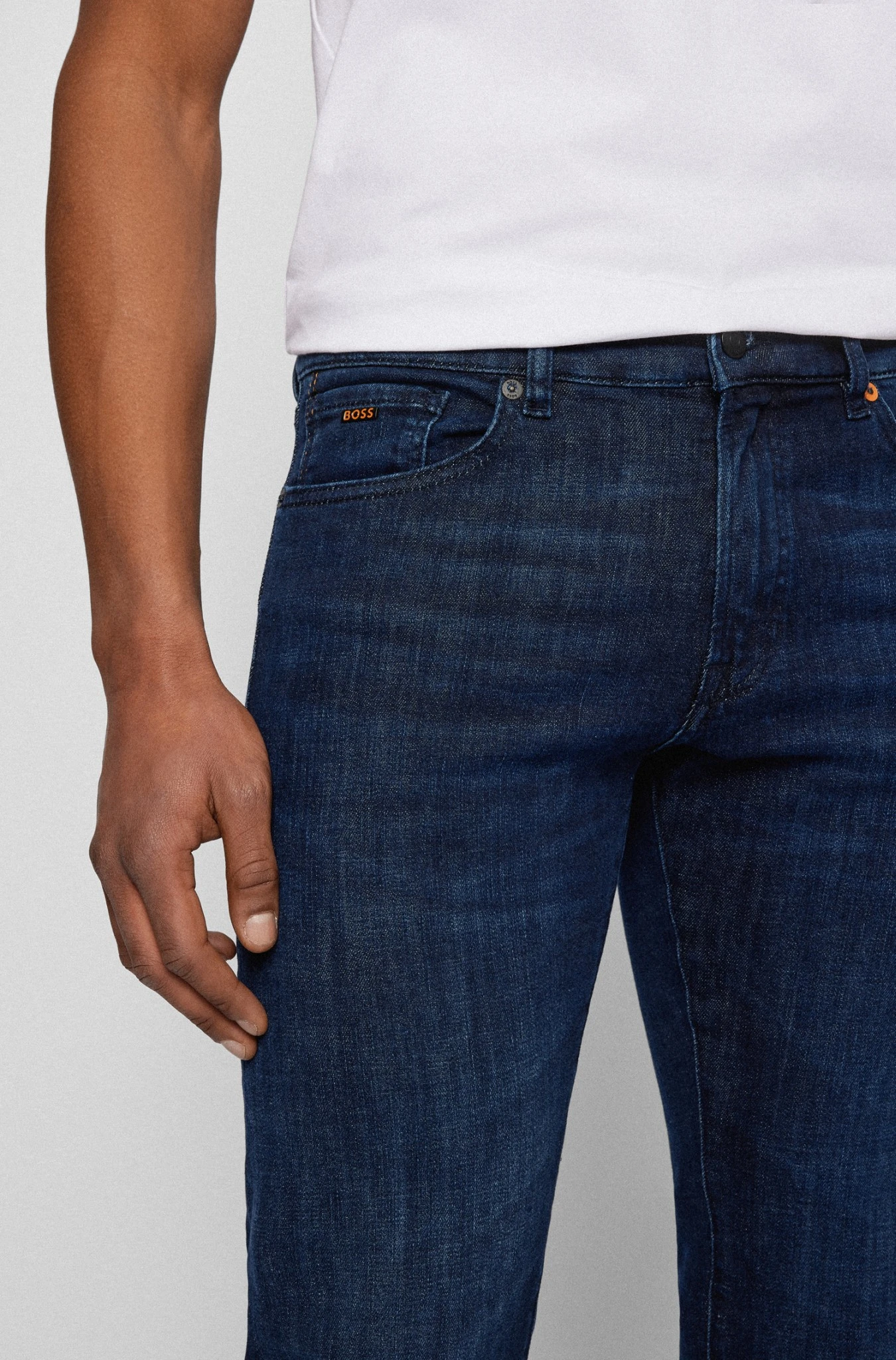 BOSS Jeans mit gerader Passform und mittlerer Bundhöhe. Die Herren-Hose aus dunkelblauem Super-Stretch-Denim verspricht optimale Bewegungsfreiheit und behält zuverlässig ihre Form bei. Dezente Treatments sorgen für einen authentischen Look. Hinten am Bund befindet sich ein Ton in Ton gehaltener BOSS Logo-Aufnäher aus Leder.