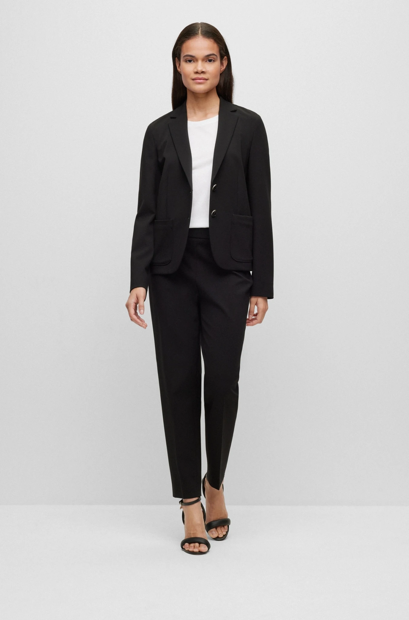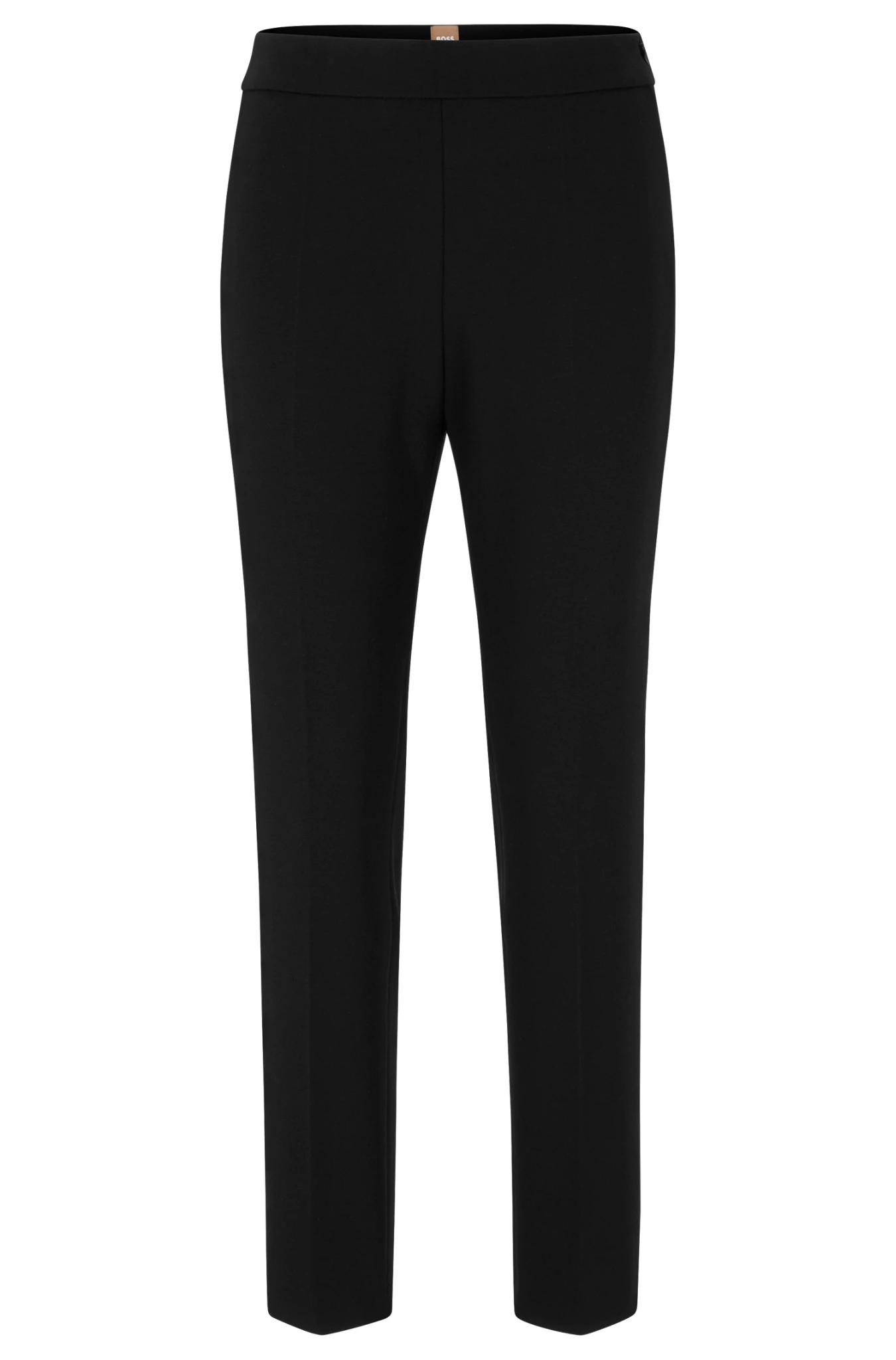 Gerade geschnittene BOSS Hose aus einem elastischen Gewebe mit hohem Bund, konischem Beinverlauf, Cropped-Länge und praktischem Reißverschluss an der Seite. Für unsere RESPONSIBLE Produkte verwenden wir immer mindestens 60 % nachhaltigere Rohmaterialien. Dieses Produkt wird mit zertifizierten Zellulosefasern gefertigt, die aus dem natürlichen Rohstoff Holz aus nachhaltiger bewirtschafteten Wäldern gewonnen werden. Gemeinsam mit externen Organisationen setzen wir uns für den respektvollen Umgang mit Urwäldern und gefährdeten Wäldern ein.
