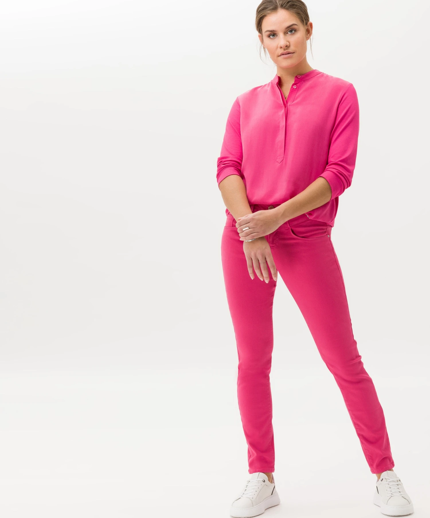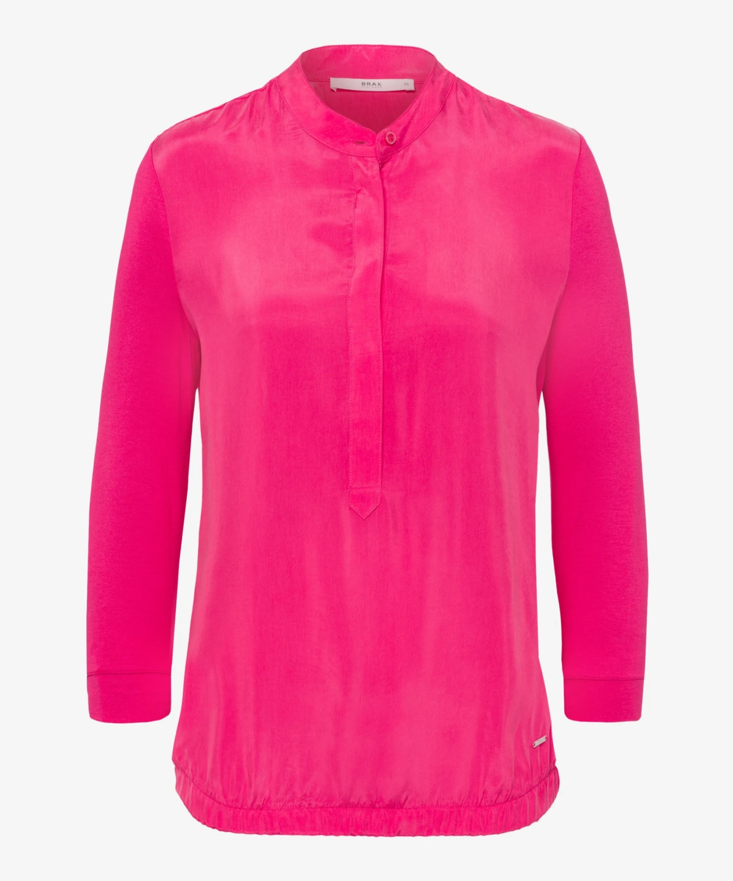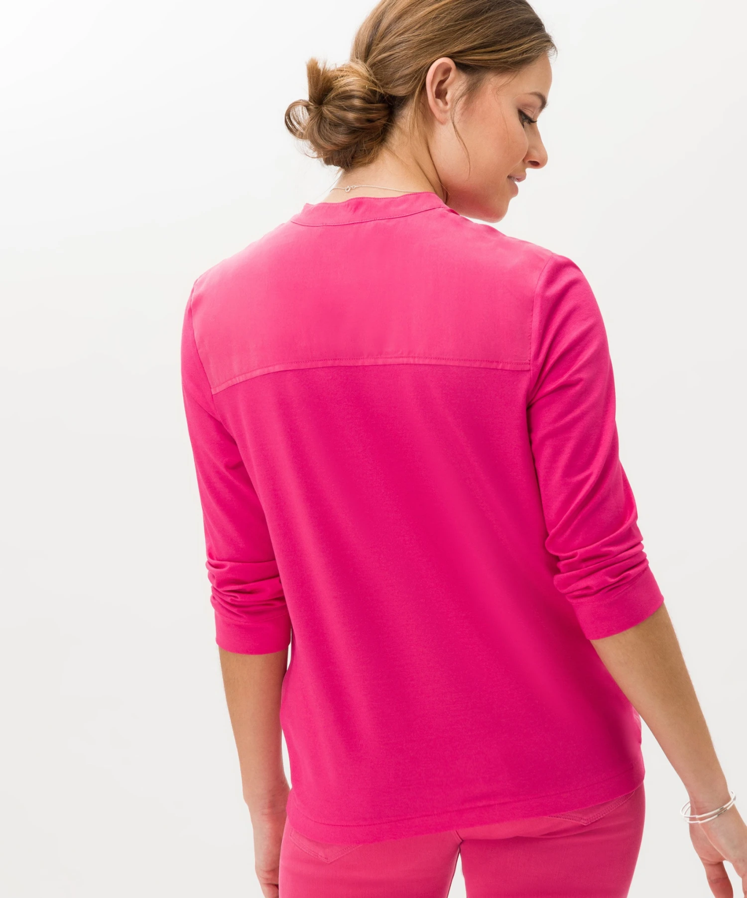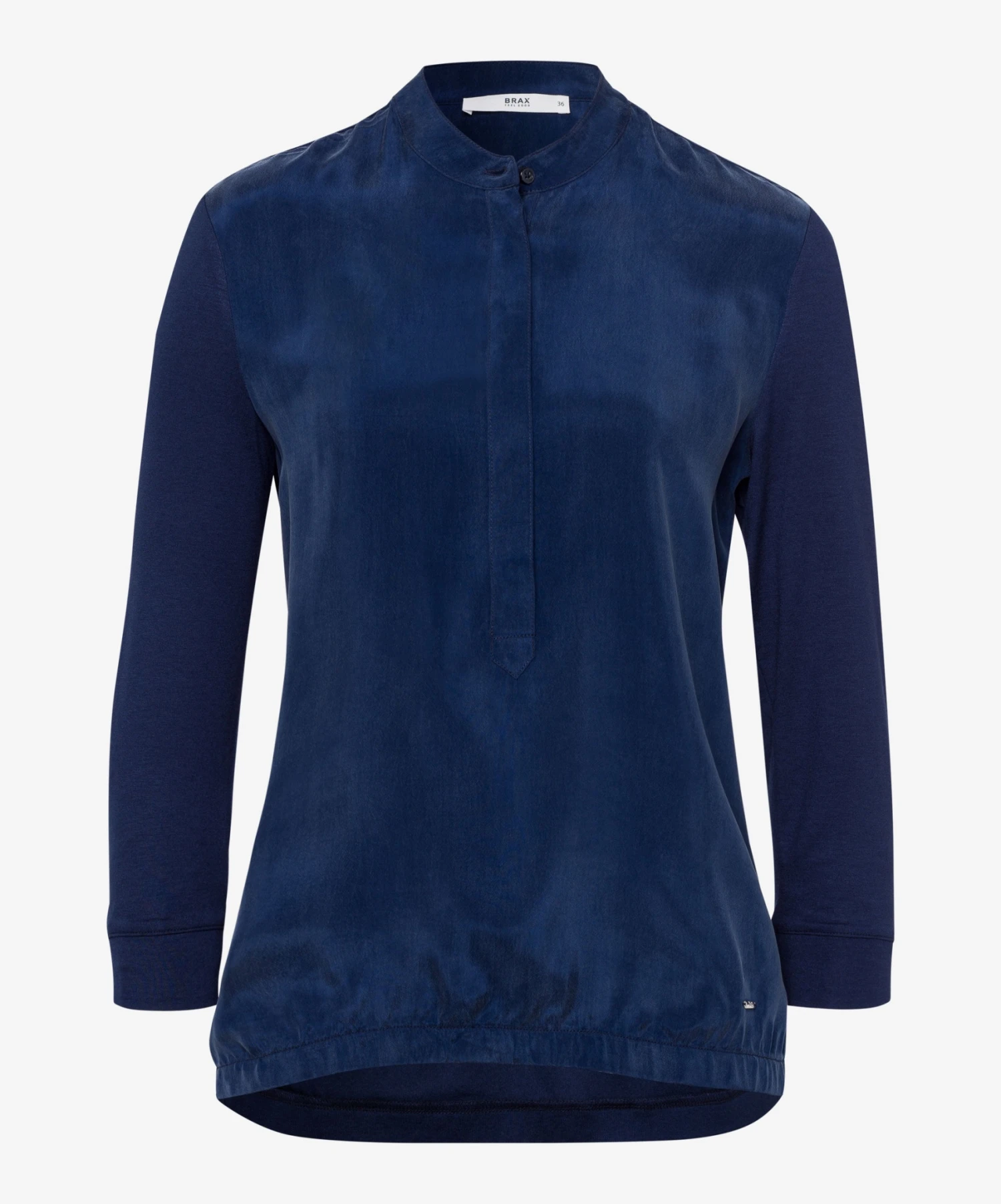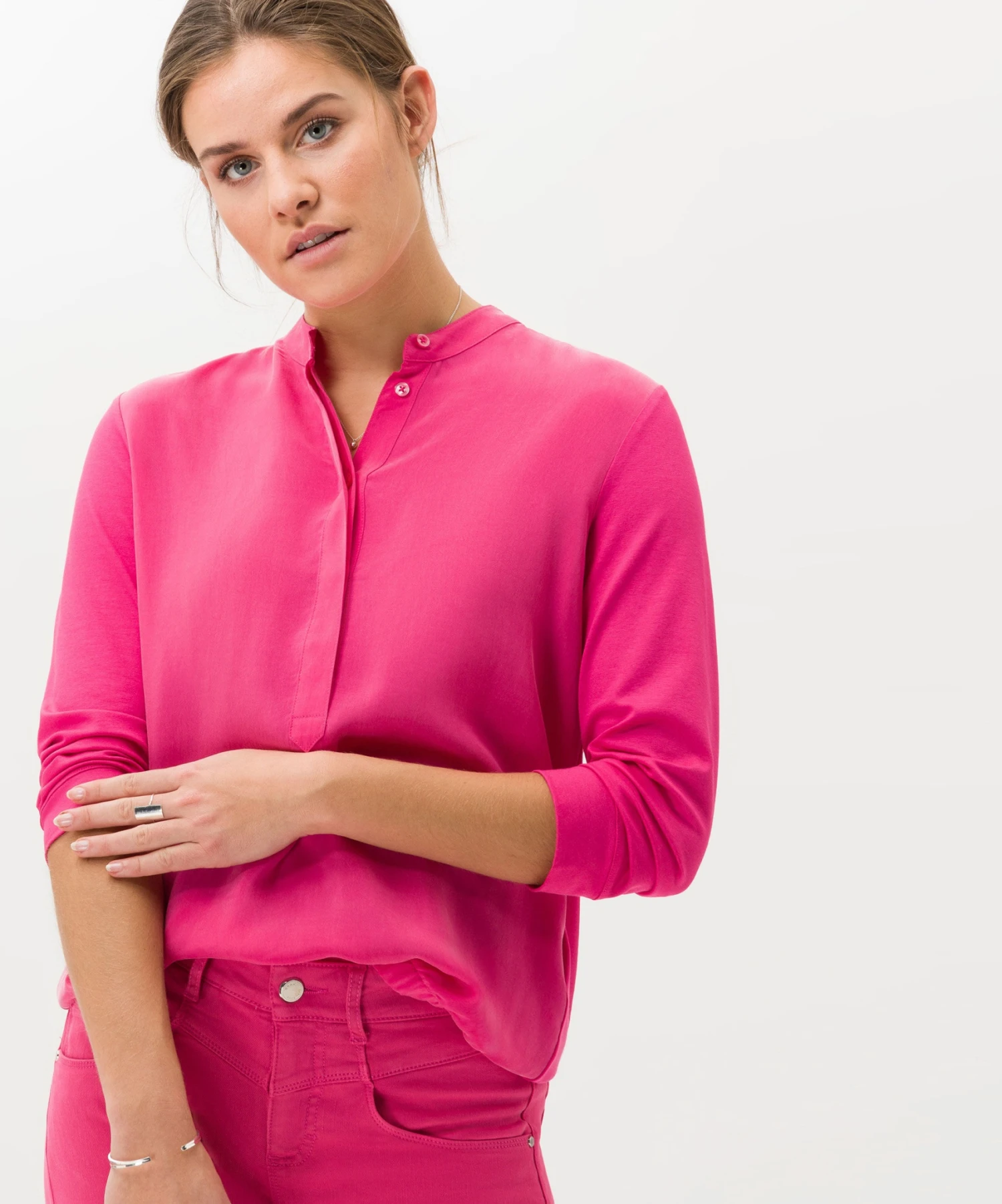 Zeigen Sie modische Kompetenz. Das Longsleeve im Style Clarissa in geschmeidiger Hybrid-Qualität begeistert durch seine hochwertige Verarbeitung und seinen brillanten Look. Jersey zeichnet sich durch ein sehr feinfädiges Maschenbild aus. Der gewirkte Stoff ist dadurch, wie bei diesem Damenshirt, glatt und geschmeidig. So zeigt sich das Shirt für Damen in einem edlen Viskosemix mit softem Handfeel. Die entspannte Silhouette des Shirts mit 3/4-Arm und modischem Stehkragen trägt zusammen mit dem modernen Web-Jersey-Mix zu einem legeren Style bei. Uni, Muster oder Motive – Jersey ist der Allrounder!