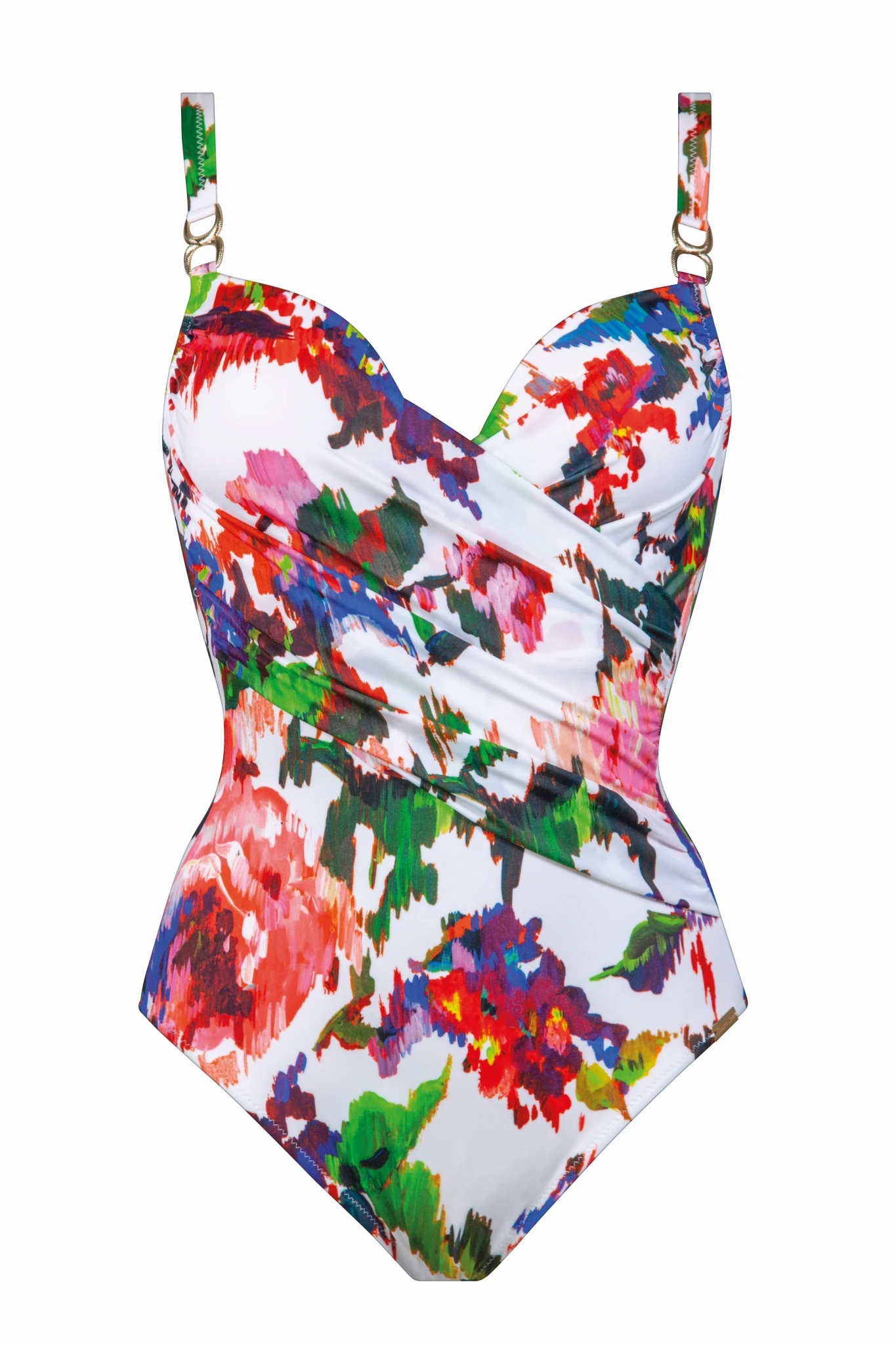 Ausdrucksstarke Aquarelldrucke spiegeln Natur und Ozean mit ihren soften, fließenden Bewegungen. Blütenmotive mit wässrigem Effekt lassen Farbflächen aus sanften, längs platzierten Pinselstrichen mit Chiné-artigem Charakter entstehen, die zugleich streckend wirken. Lippenstiftfarben in Coral, Apricot oder Pink verbinden sich mit frischem Frühlingsgrün und Ultramarine, während strahlendes Weiß dem Print eine sommerliche Note verleiht.