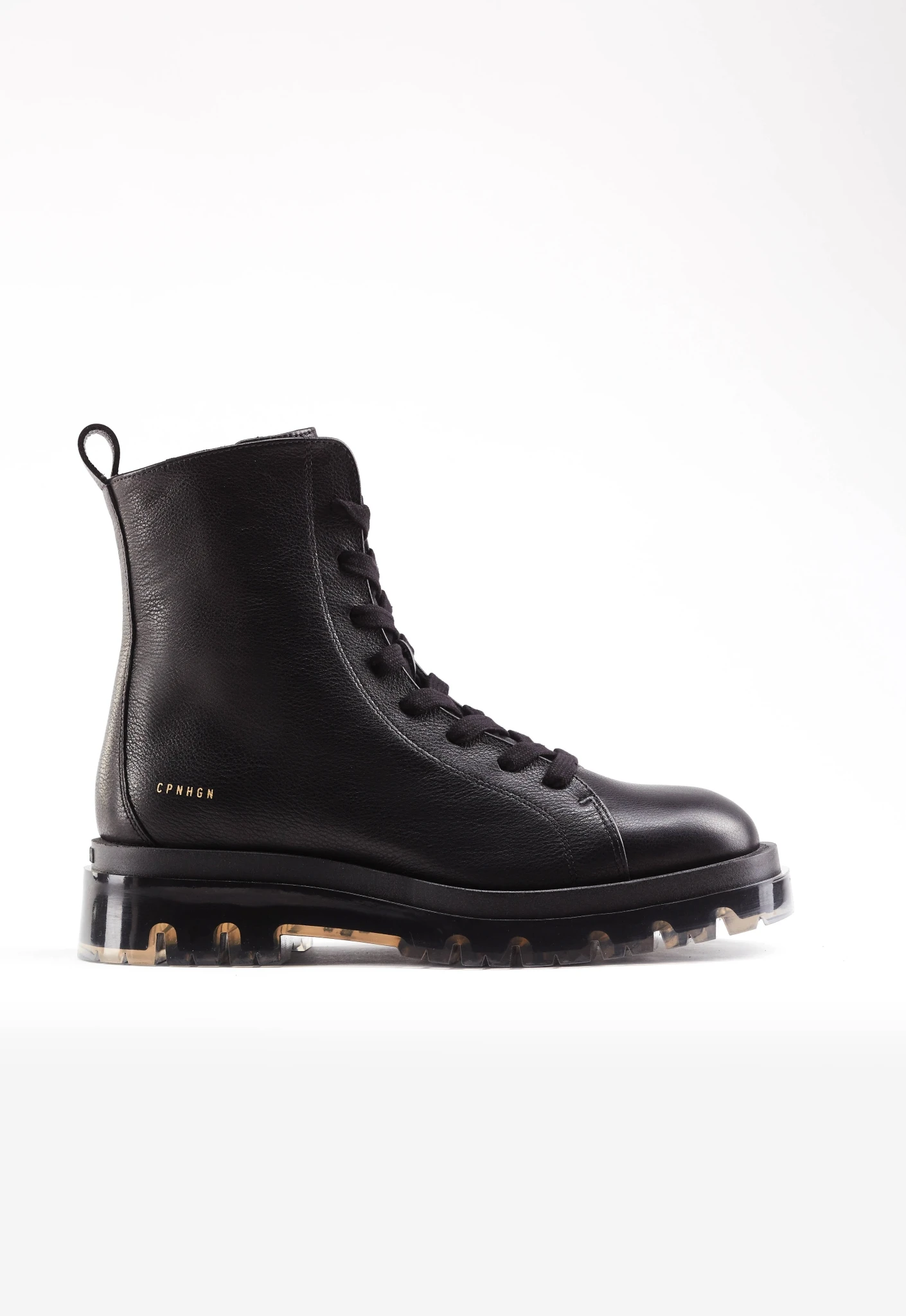 Schnürstiefel aus Glattleder mit einer klobigen, transparenten Sohle. Kontrastabnäher. Seitlicher Reißverschluss. Zugschlaufe an der Ferse. Dezentes Branding an der Außenseite. Abgerundete Zehenpartie. Profilsohle aus Gummi mit opaker Struktur. Weiches Innenfutter aus Leder. Herausnehmbare Innensohle aus Leder. Ein markanter Style zum Auffallen.