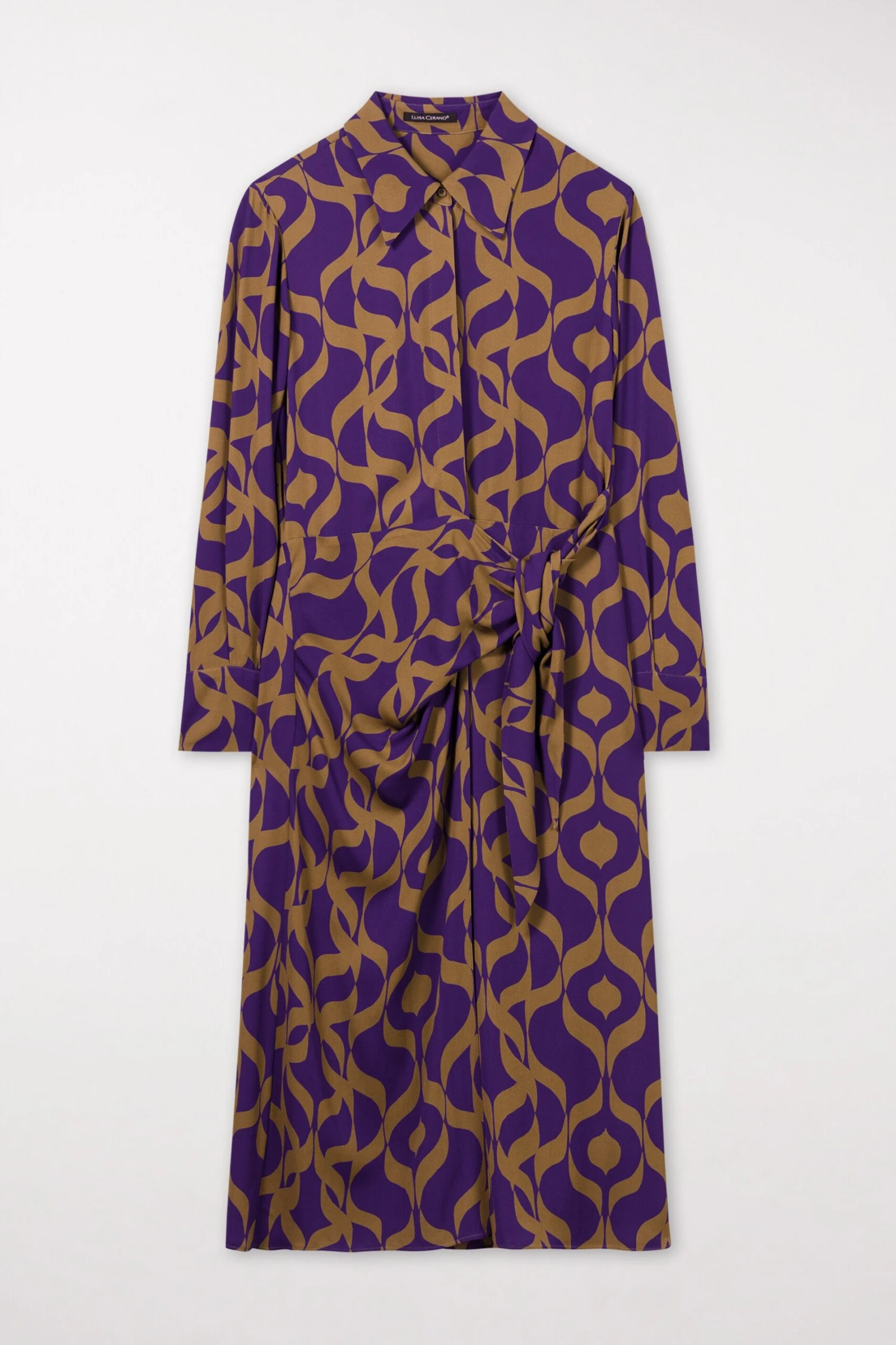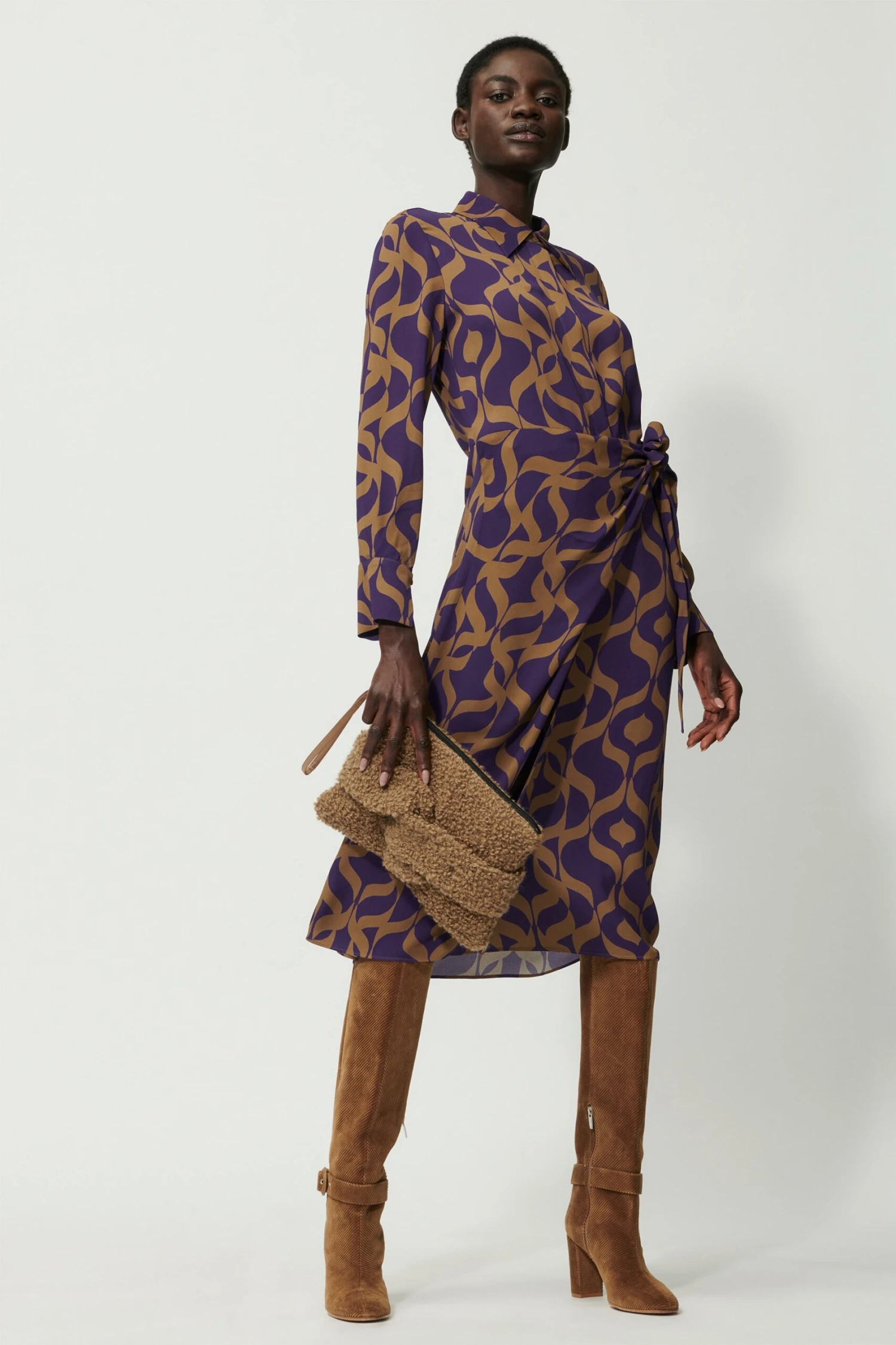 Midikleid mit exklusivem, graphisch interpretiertem Tapisserie-Dessin. Das aus blickdichtem Viskose-Crêpe gefertigte Kleid besitzt eine verdeckte Knopfleiste sowie ein raffiniert platziertes Bindeband in der Taille. Unser Model ist 178 cm groß und trägt Größe 36.