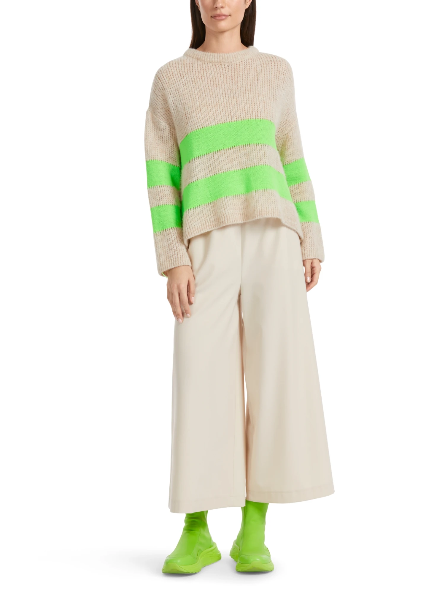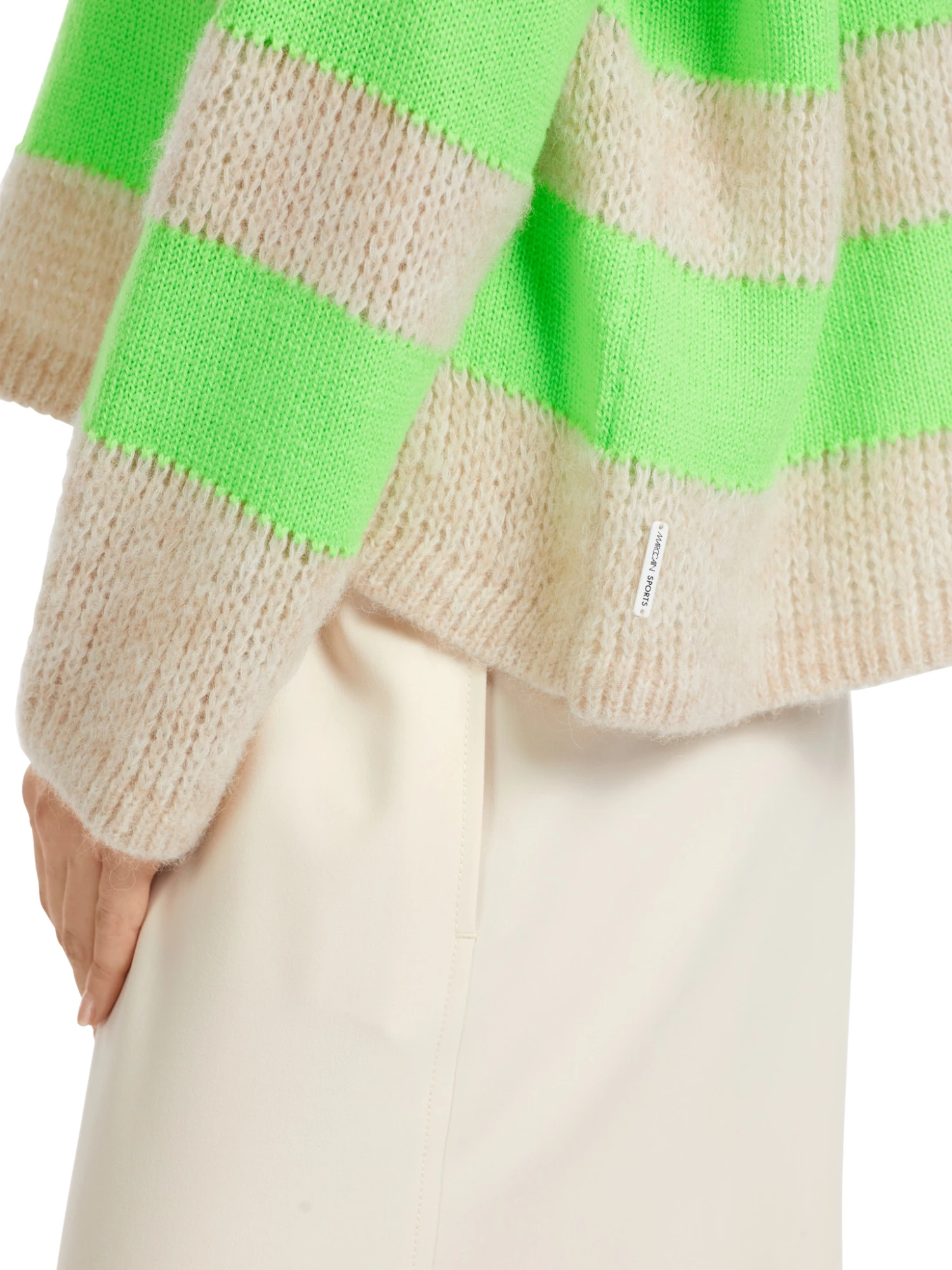 Der Pullover ist aus einem soften Garn mit Alpaka gestrickt. Das feine Garn und die lockere Strickart machen ihn supersoft. Der Blockstreif ist glatt gestrickt und setzt sich daher farblich UND strukturell ab. Der Pulli ist „Knitted in Germany“: Er wird in Deutschland mit modernsten Technologien gestrickt und veredelt und die einzelnen Teile wie Rücken- und Vorderteil etc. werden in europäischen Partnerbetrieben zusammengenäht.