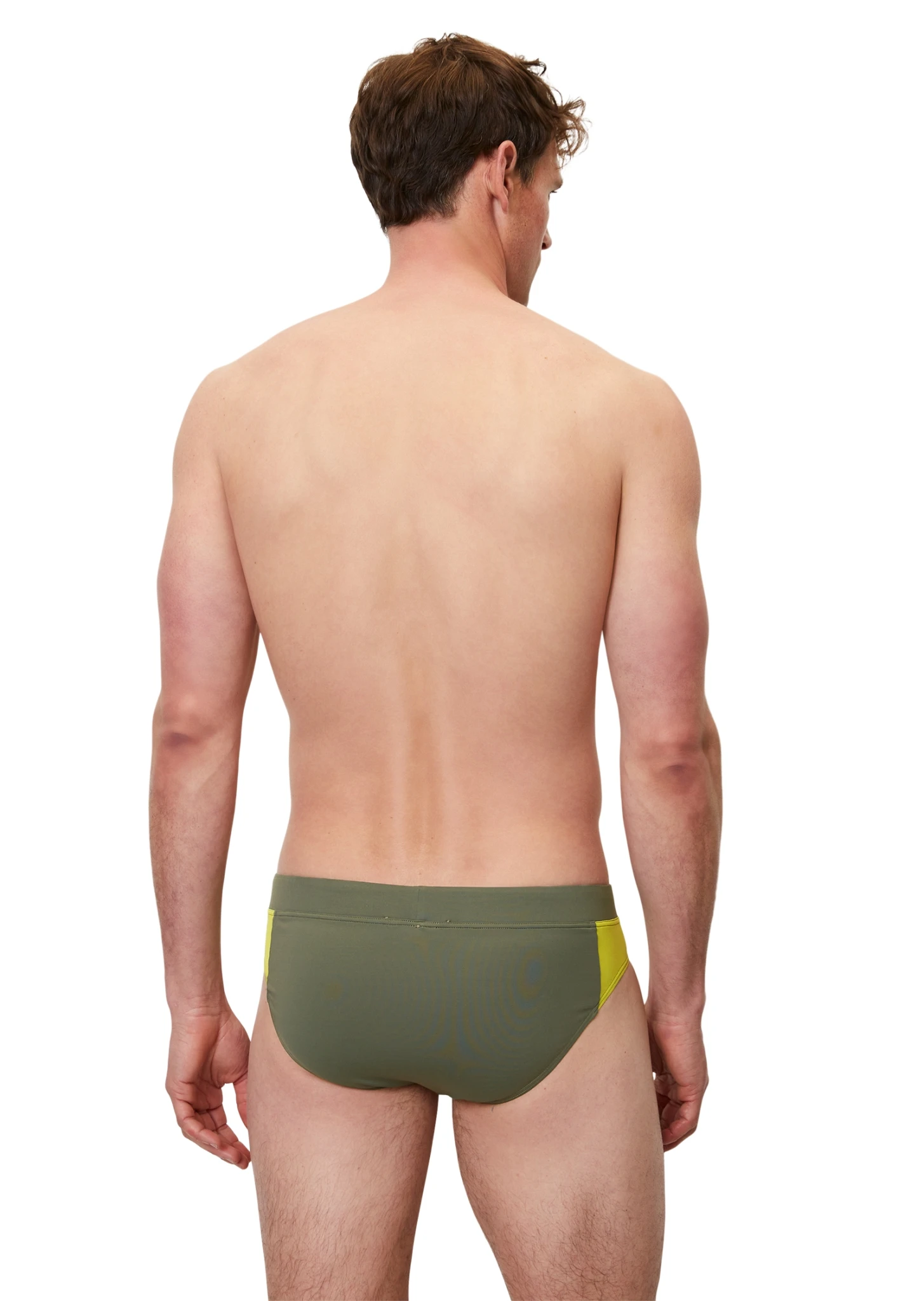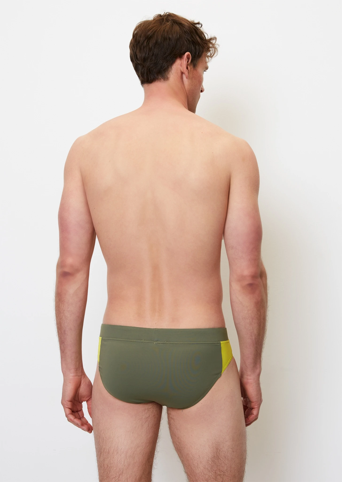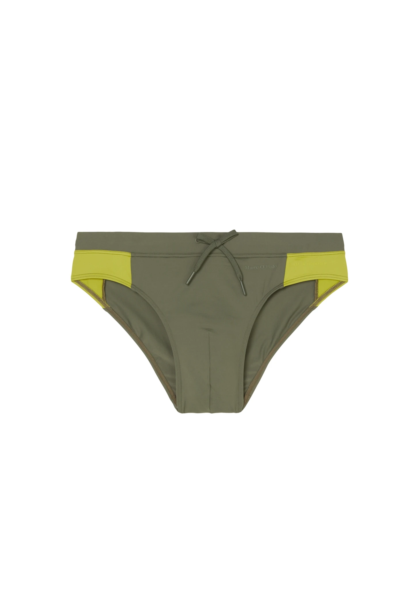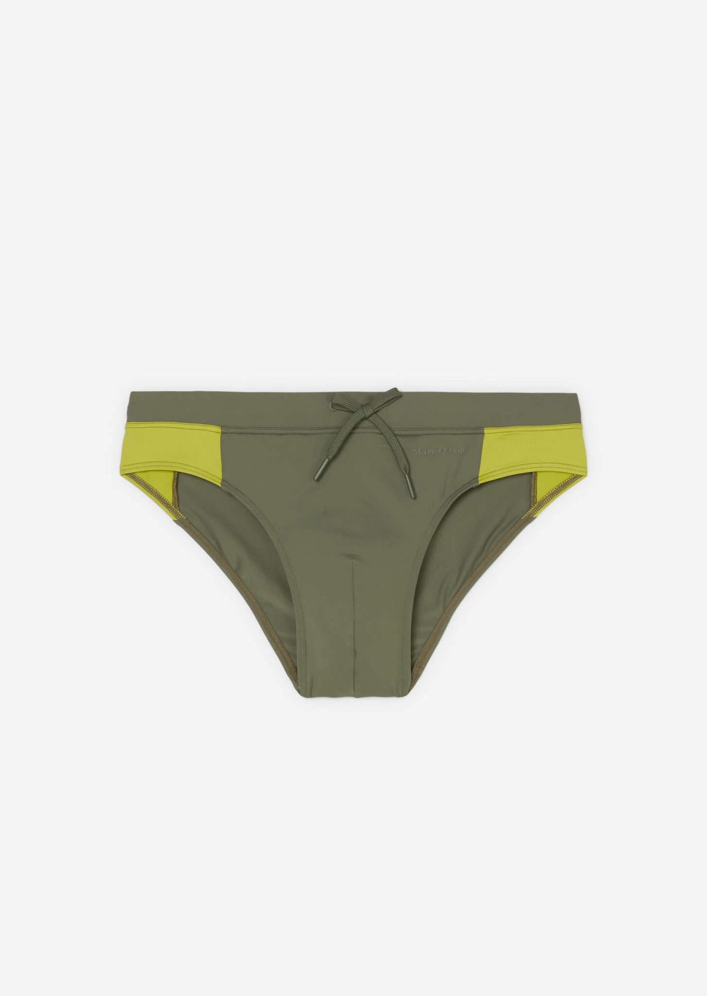 Die minimalistischen Badehosen sind aus hochwertigem italienischem Stretch-Stoff geschnitten, mit kontrastierenden seitlichen Panels, breitem elastischem Bund und farblich passenden Accessoires.