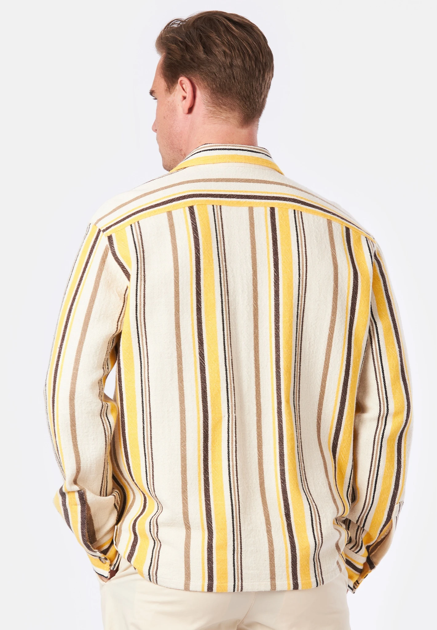 Sommerliche Alternative zu Cardigan, Sakko und Jacke: das lässige Overshirt in legerer Raw-Cotton-Qualität kommt hier im unregelmäßigen Streifen-Dessin. Hergestellt bei dem italienischen Weber MANTECO® sorgt der hochwertige Bio-Baumwolle-Mix mit Anteilen von recyceltem Polyester für hohen Tragekomfort. Im lockeren Fit mit Kentkragen, durchgehender Knopfleiste, geknöpfter Brusttasche und gerader Saumlinie. Die Knöpfe sind in Horn-Optik gehalten.