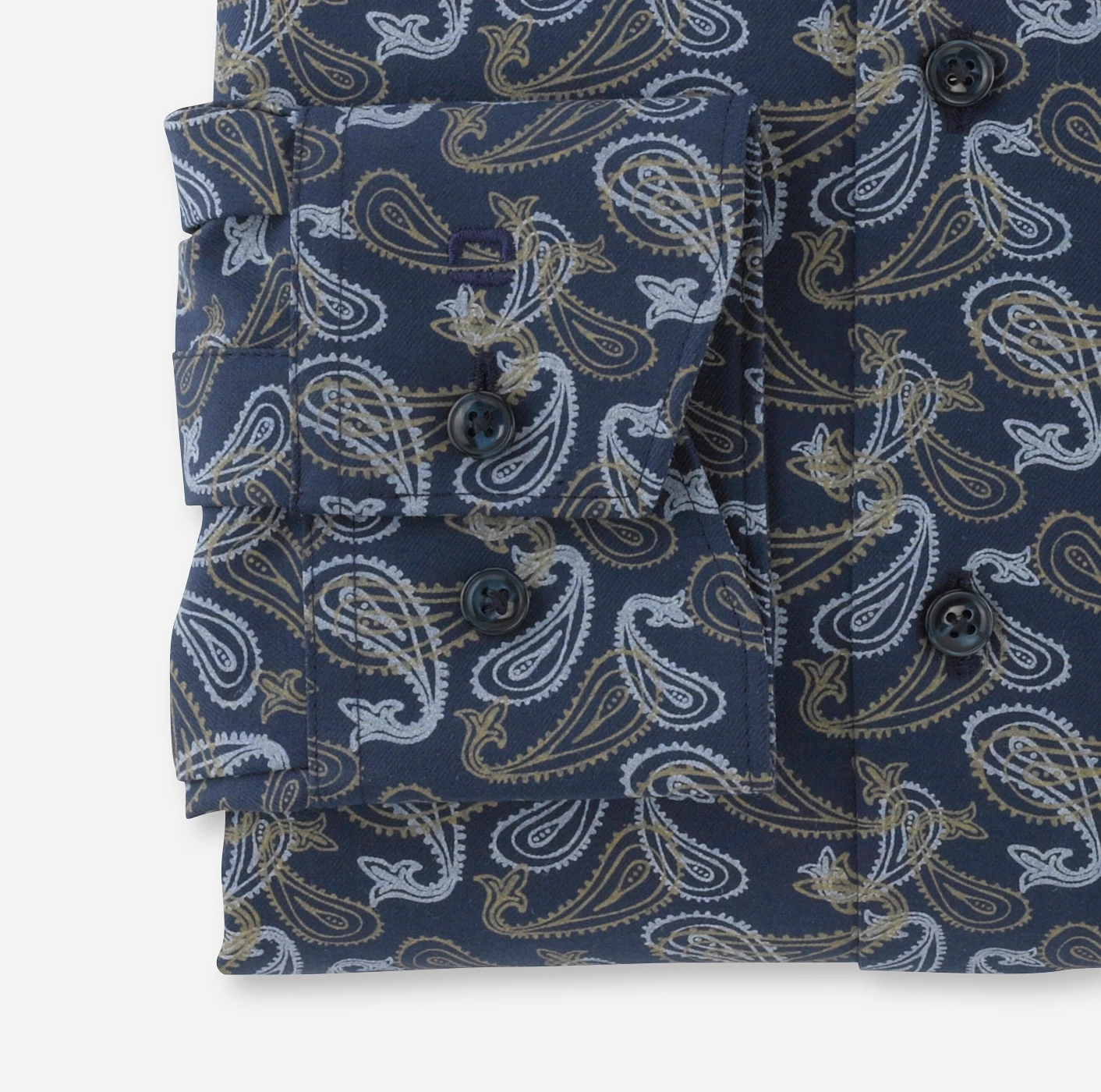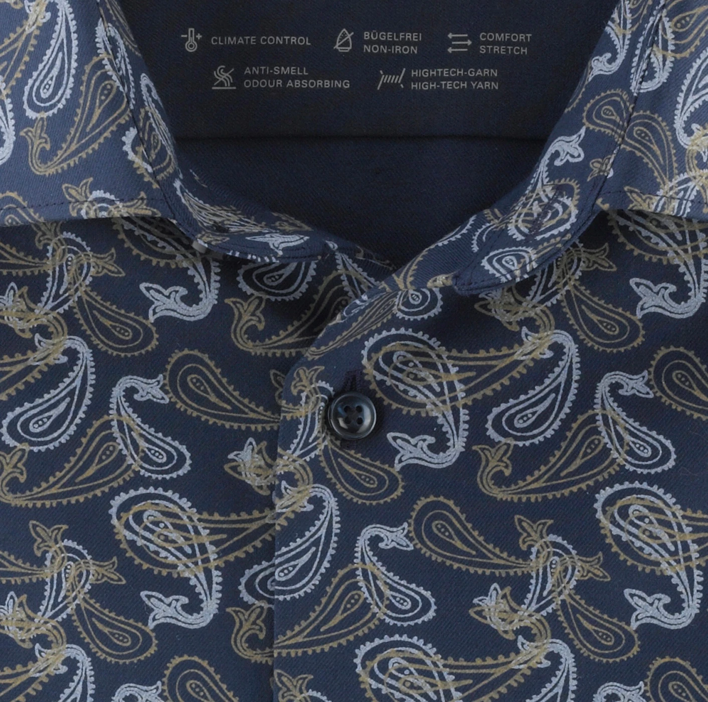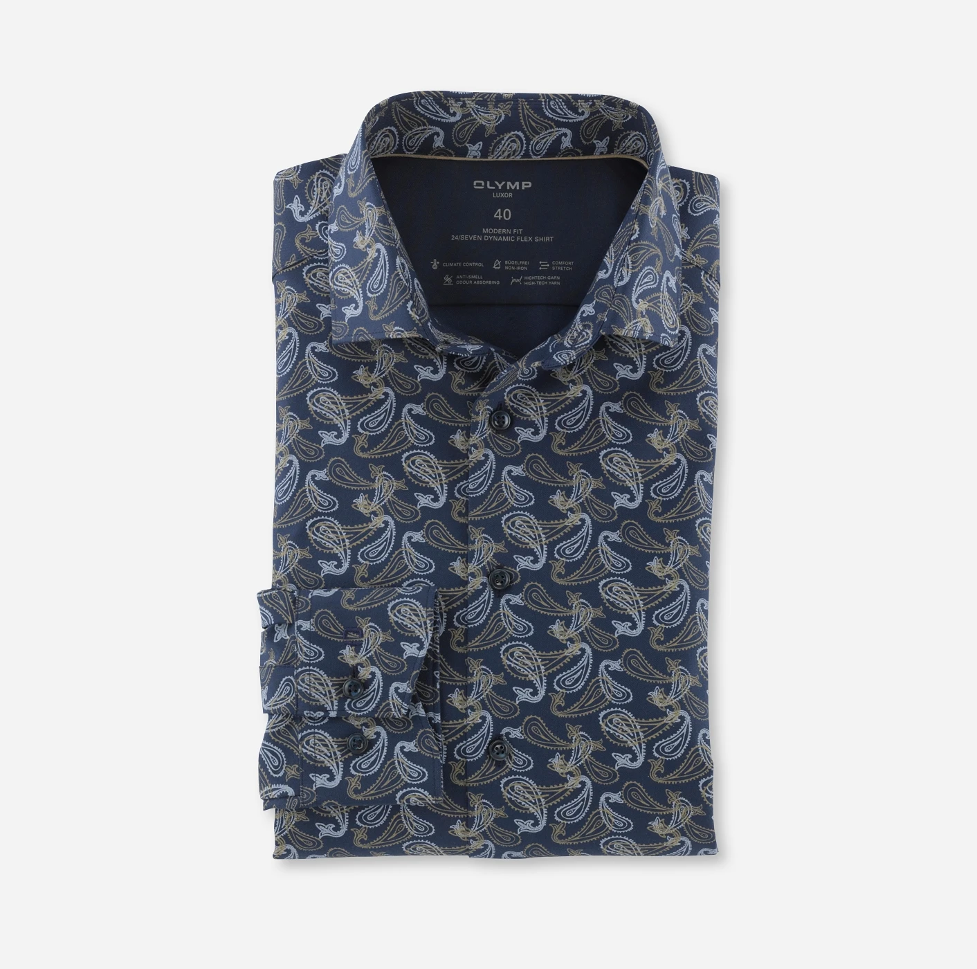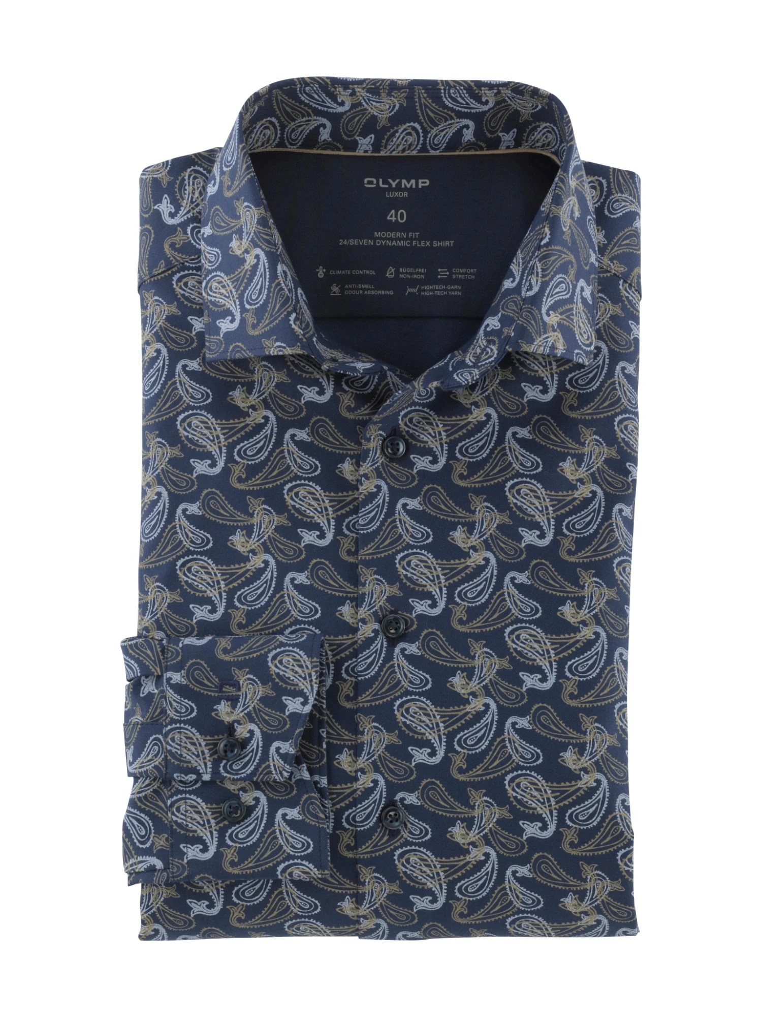 Dynamic-Flex-Jersey und CLIMATE CONTROL – die kongeniale Mischung von Baumwoll-, Poly- und Elasthanfasern. Sieben funktionale Highlights, die dieses sportlich-elegante OLYMP Luxor modern fit 24/Seven auszeichnen. Es ist atmungsaktiv, geruchsabsorbierend, dehnbar, schnelltrocknend, bügelleicht sowie feuchtigkeits- und temperaturregulierend. All-in-one. Das klassische Paisley-Muster in attraktiver körpernaher Linie wird harmonisch unterstrichen durch einen smarten Modern Kent. Nachhaltig produziert, OLYMP – nicht nur ein modisches Statement für die Zukunft.