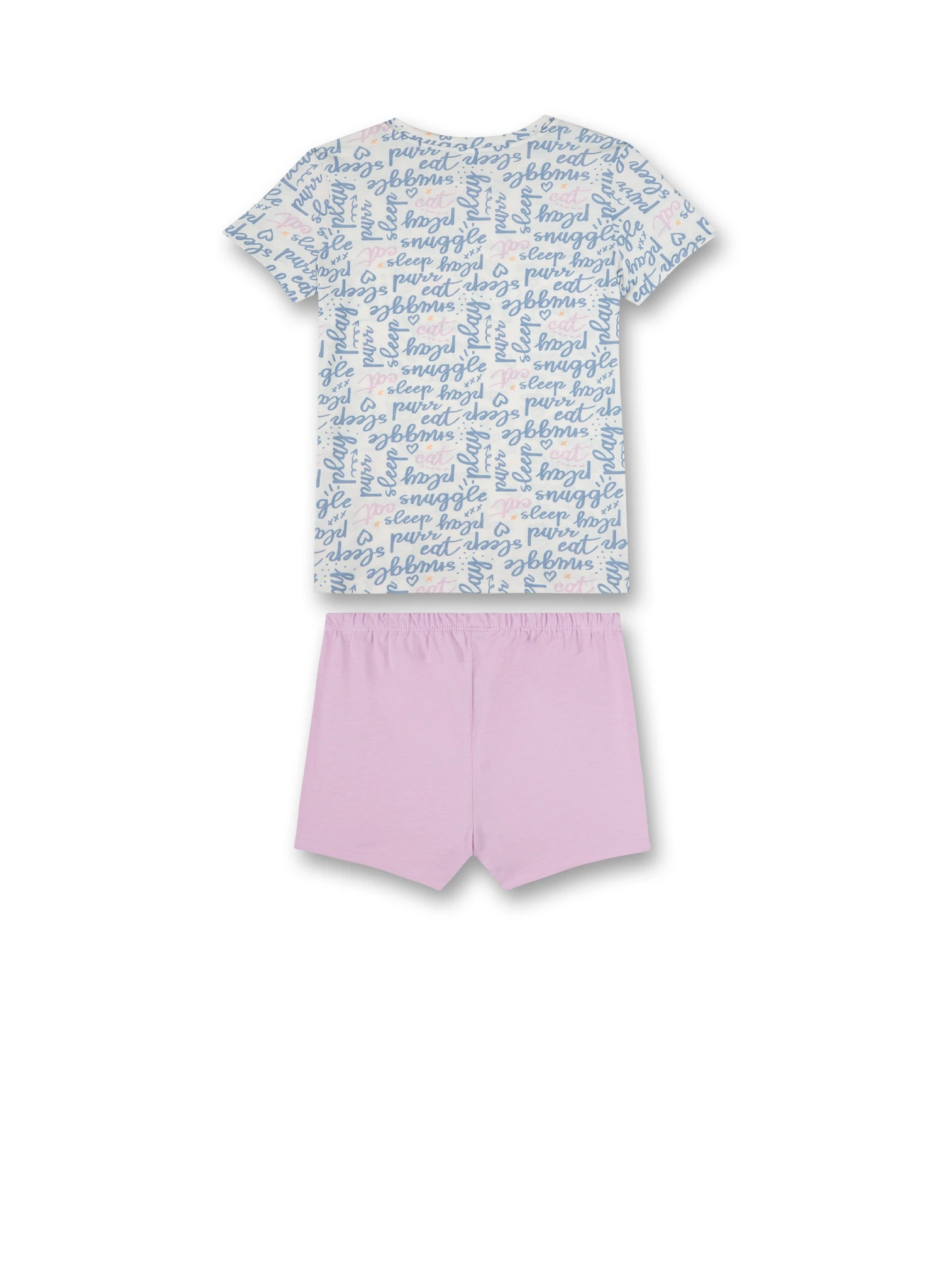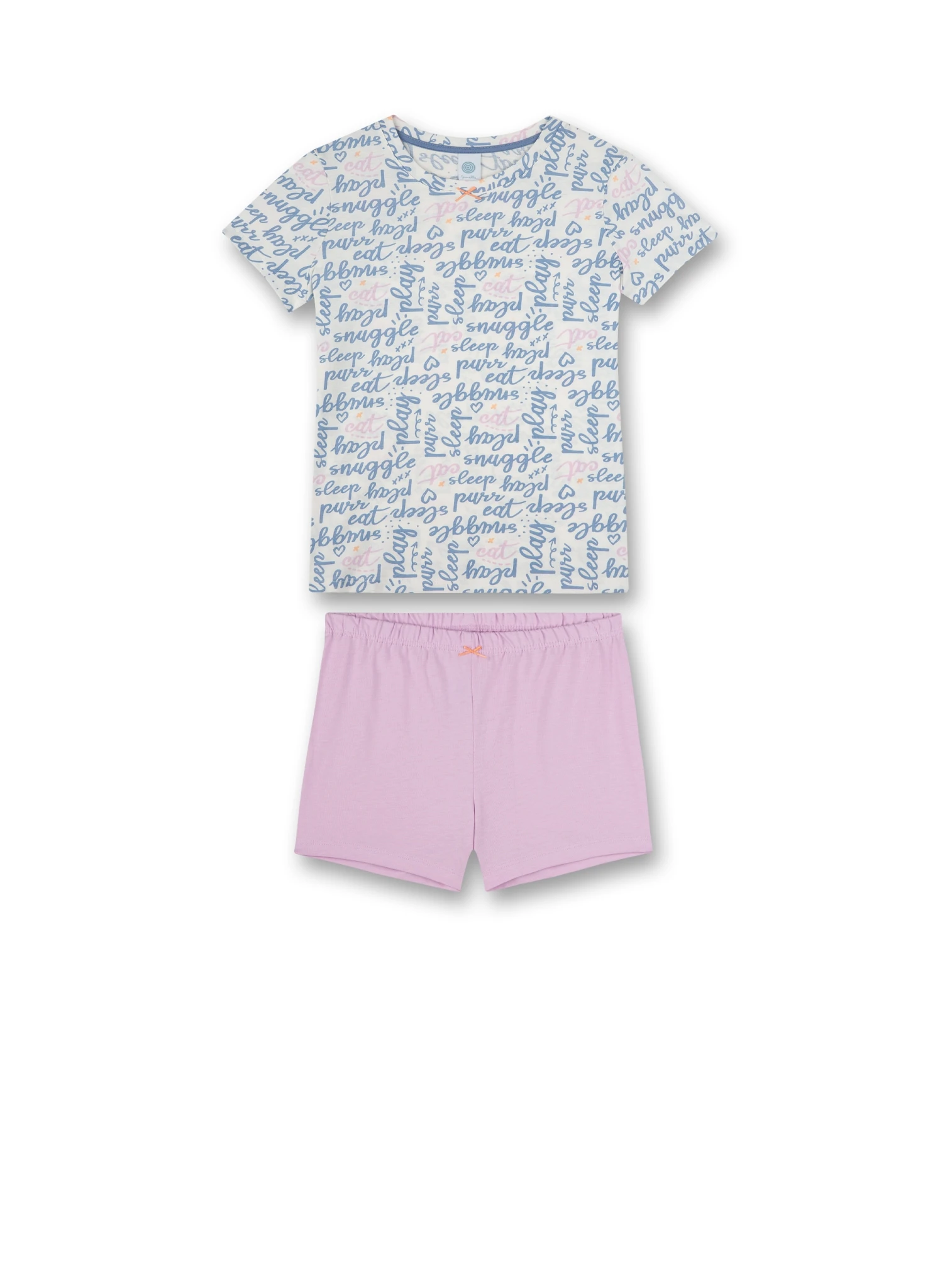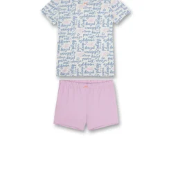 Sommerlich leichter Mädchen-Schlafanzug von Sanetta mit einem ausgefallenen Allover auf dem Oberteil und einfacher Basic Hose in einem zarten Rosa.