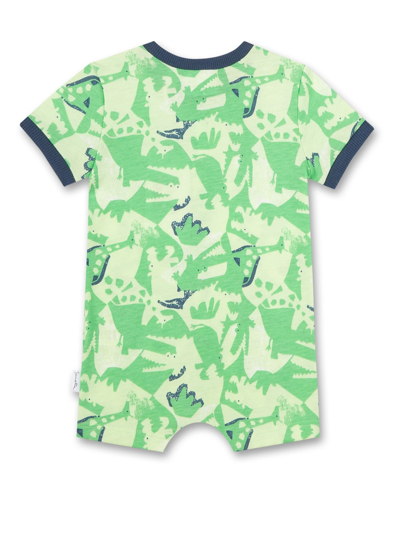 Kurzer Jungen-Overall in Blau von Sanetta Kidswear mit einem niedlichen Dinos aus hochwertiger Bio Baumwolle.