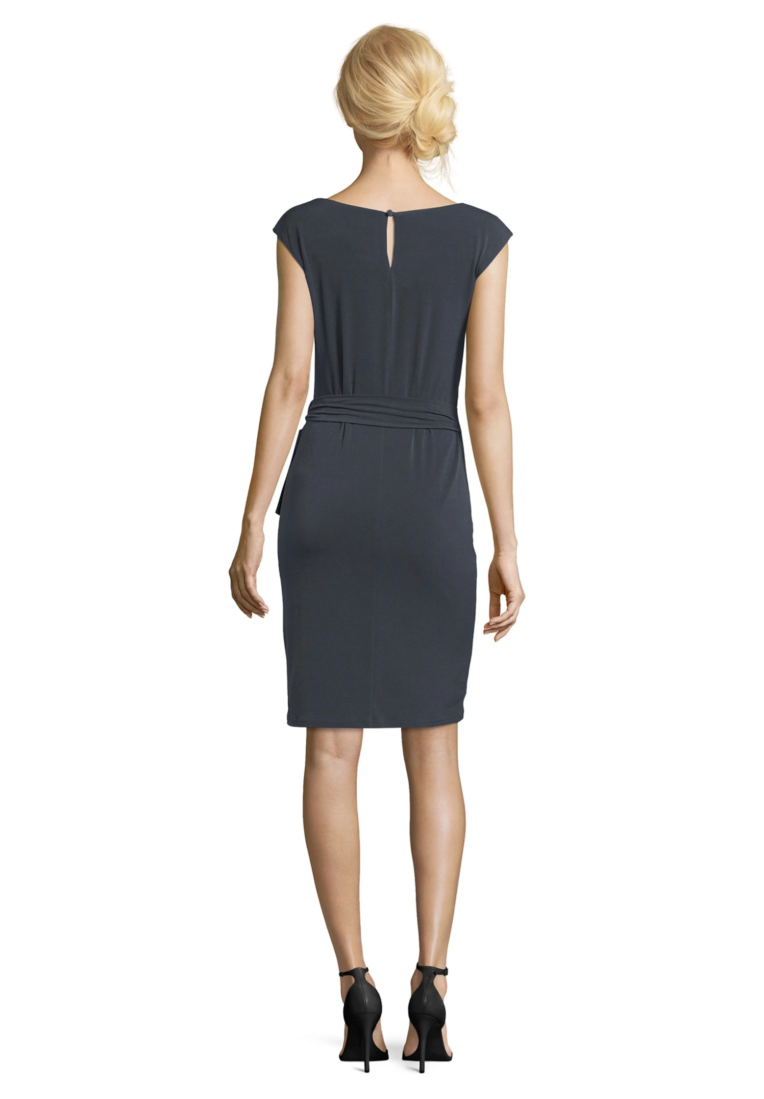 Dieses wunderschöne dunkelblaue Etuikleid ist Dank feinem Jersey angenehm zu tragen und figurbetont zugleich. Details wie der lockere Wasserfallausschnitt und die Schleifenbindung seitlich machen das Kleid besonders.