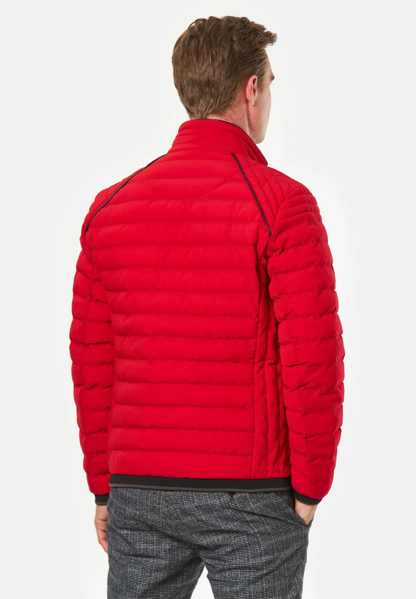 - Mit geschwungenen Paspelierungen im Rücken- und Schulterbereich sowie am Kragen